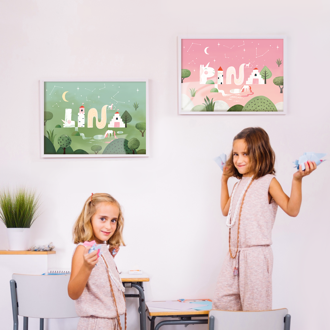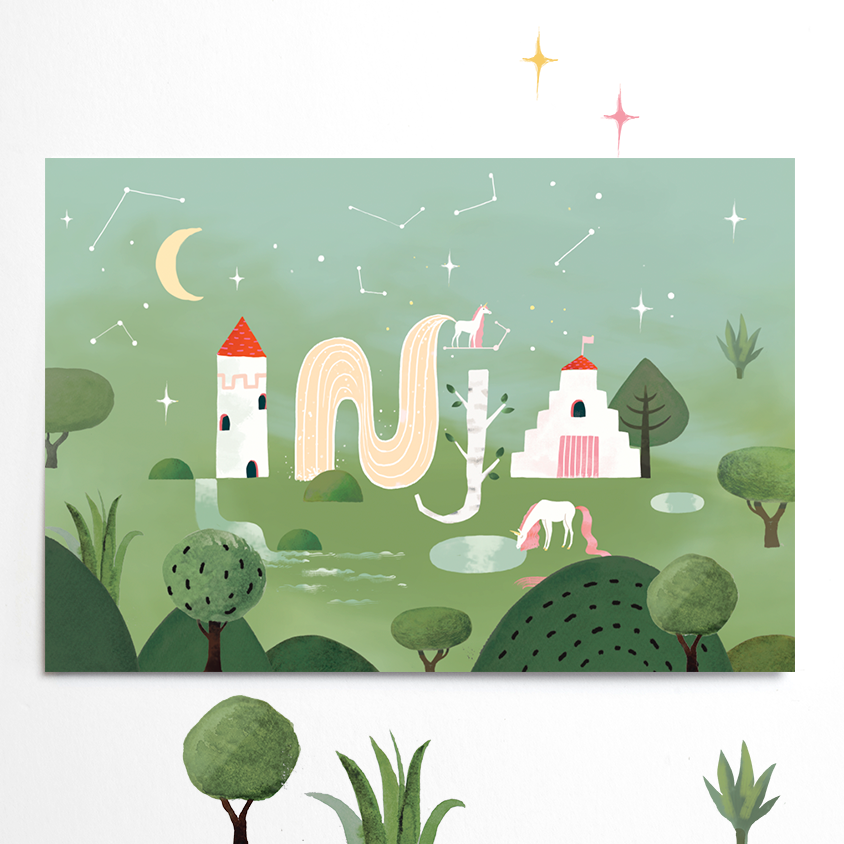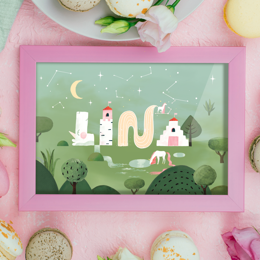 Ime bo narisano po kolekciji Luna in samorogi, kjer se črke spremenijo v samoroge, gradove, repke in zvezdice.