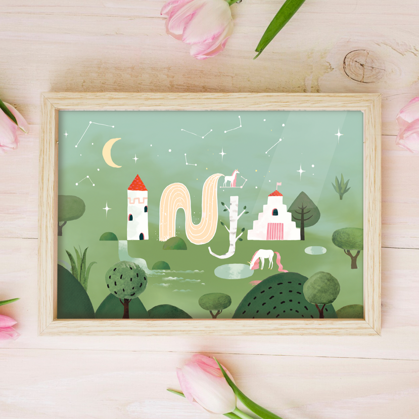 Ilustracija imena za hčerko, vnukinjo, novorojenčico ali kot posebno darilo za deklico, ki obožuje pravljice.